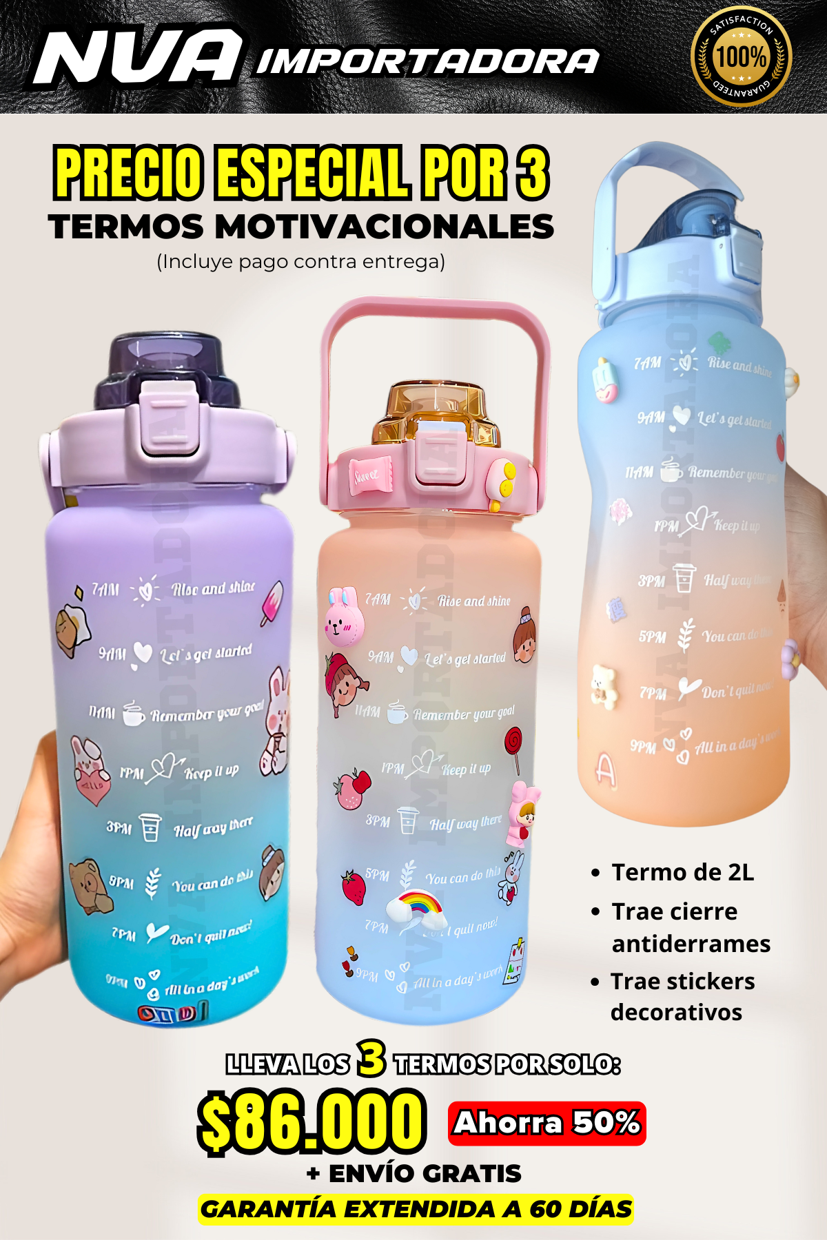 3 termos motivacionales de 2L c/u + Stickers y Pines decorativos